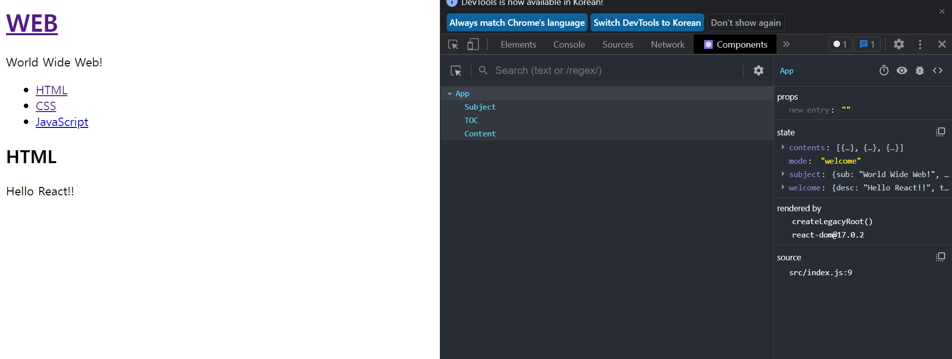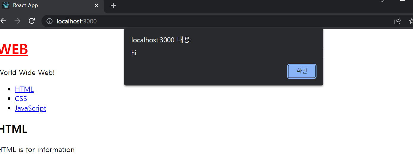 - WEB์ ํด๋ฆญํ์ ๋ App์ด๋ผ๊ณ ํ๋ ์ปดํฌ๋ํธ์ ๋ชจ๋๊ฐ์ welcome์ผ๋ก ๋ฐ๊พธ๊ณ ์ถ์