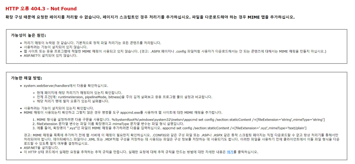 ์ง๋์ฃผ์ ๋ IIS๋ฅผ ์ง์ ์ง๋ง ๊ณ์ ์ด ํ๋ฉด์ด ๋จ๊ธธ๋ ๋ค์ ๊น๊ณ MIME ๋งคํ ํ์ฅ์๋ฅผ ์ถ๊ฐํด ๋ญ๊ฐ ์ผ๋ ๋ฑ๋ ํ๋ฉด์ ๋์ ๋ค