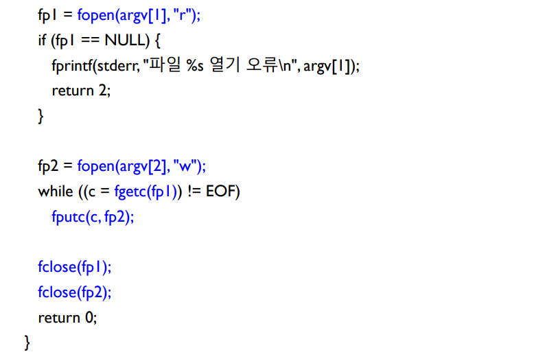 - 파일이 열리면 fgetc(fp) 함수를 호출해 첫번째 파일로부터 한 문자씩 읽어서 읽은 문자를 fputc(c, fp2)를 이용해 두번째 파일에 쓰기