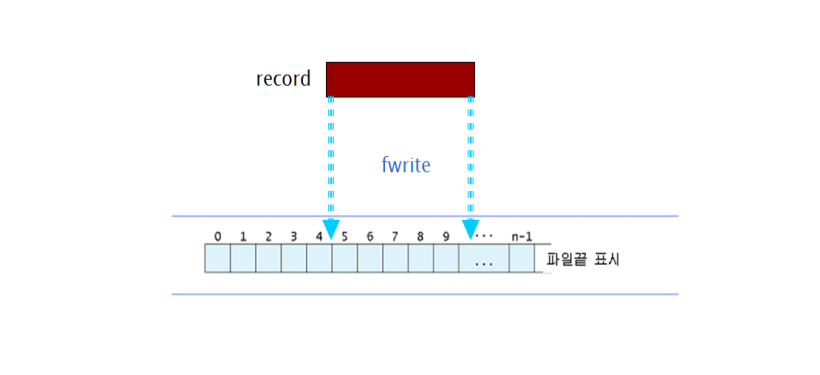 - 파일 포인터 fp가 가리키는 파일에 buf에 저장되어 있는 size 크기의 블록을 n개 기록