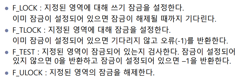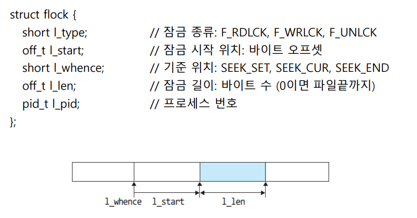 - 파일 내의 어떤 영역에 대해 잠금을 하려면 먼저 lseek() 함수를 이용해 현재 파일 위치를 그 영역의 시작 위치로 이동한 후에 잠금할 때 영역의 길이를 명시